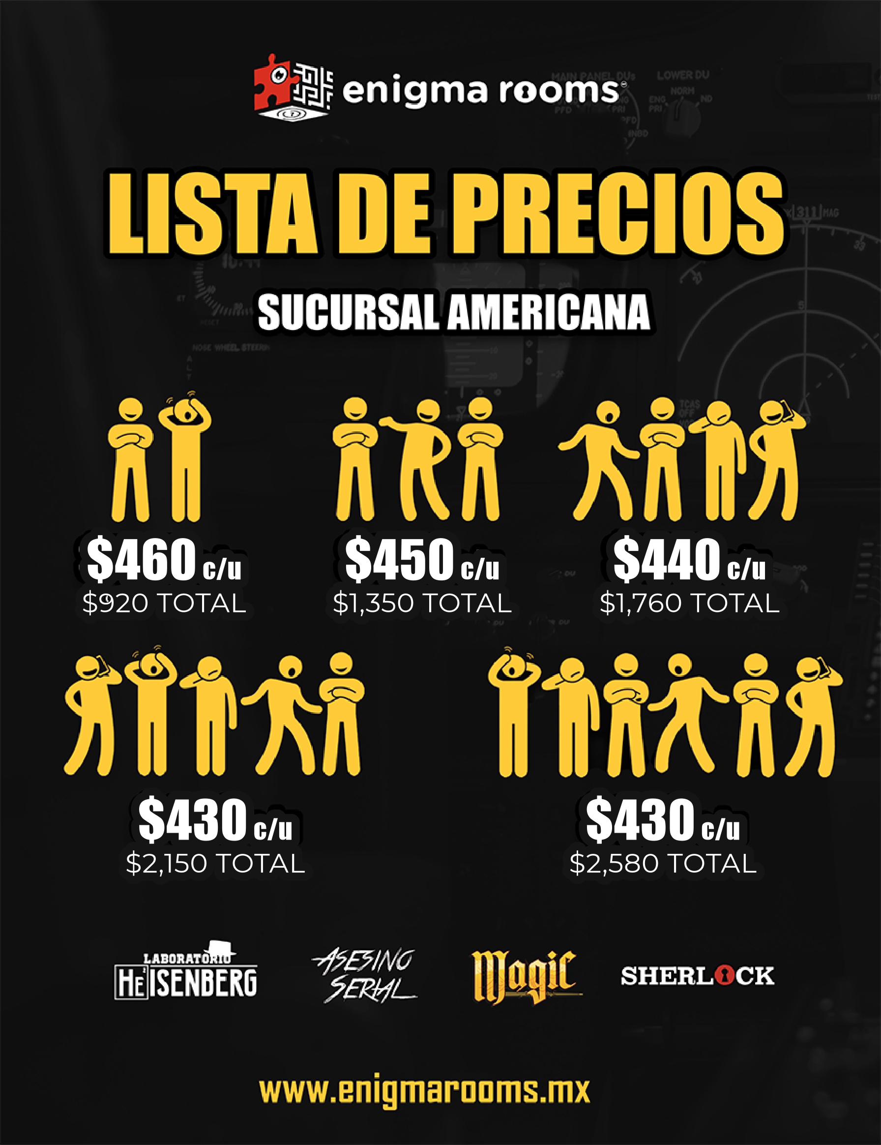 *** Los precios están en MXN e incluyen 60 minutos de juego en el Enigma Room® de tu elección. Todos los precios son más IVA. Puedes solicitar tu factura el día del evento. El pago se realiza en la sucursal antes de entrar al Enigma Room® las formas de pago son: Efectivo, Tarjetas de Crédito / Débito (MasterCard y Visa). Enigma Rooms® es un evento en vivo por lo que es necesario llegar 15 minutos antes de tu reservación. En caso de de no presentación se realizará un cobro mínimo(2 personas) por el servicio a la tarjeta registrada en la plataforma.