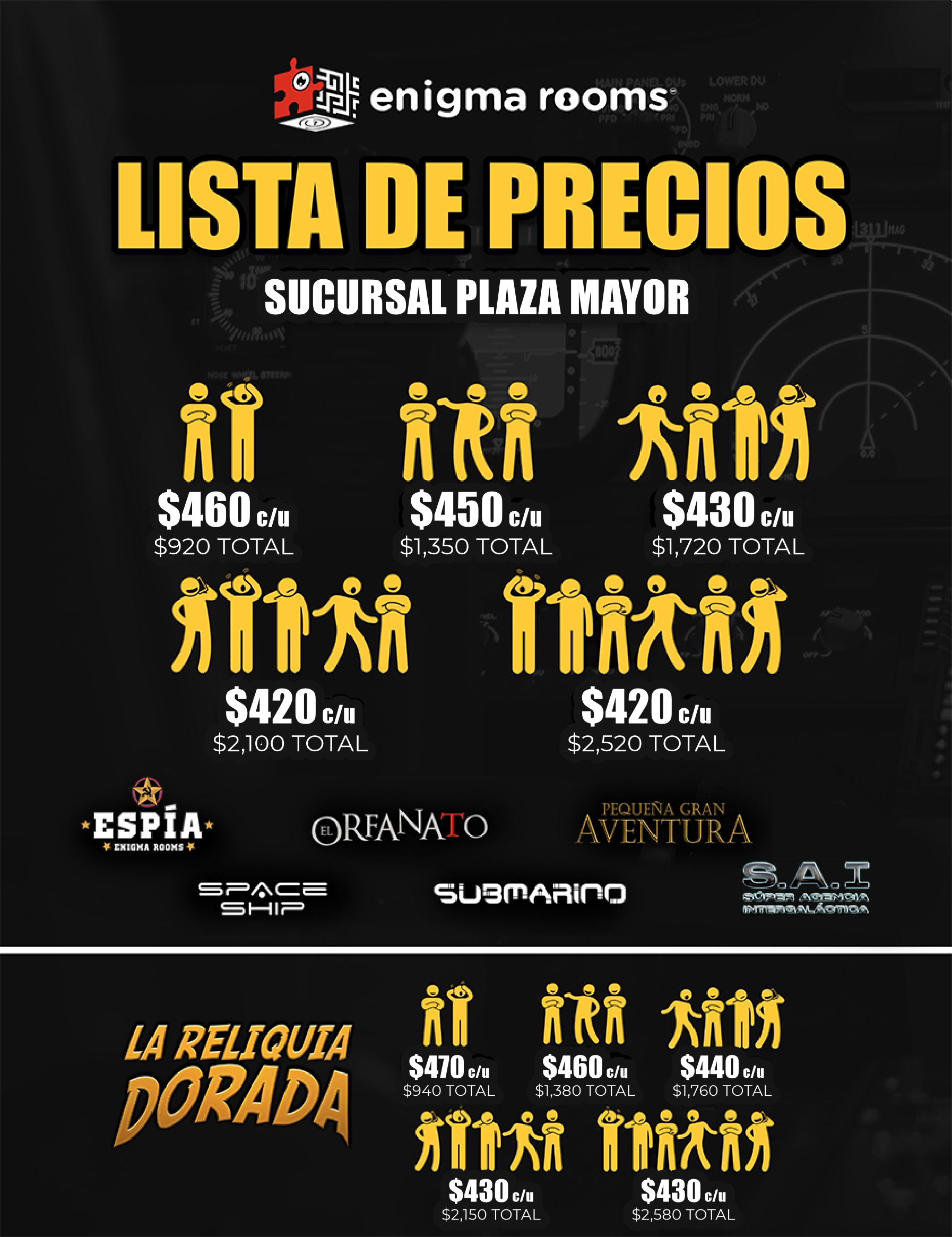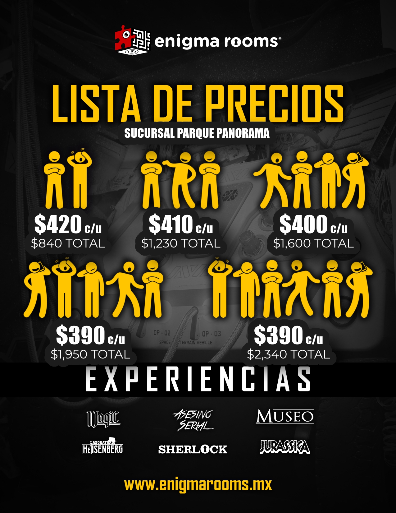 Los precios señalados son en MXN e incluyen 60 minutos máximo de juego en el Enigma Room® de tu elección. Todos los precios son más IVA, en caso de requerir factura. La factura se debe solicitar el día del evento, siendo únicamente facturable en el mes en el que se genera el ticket de venta.